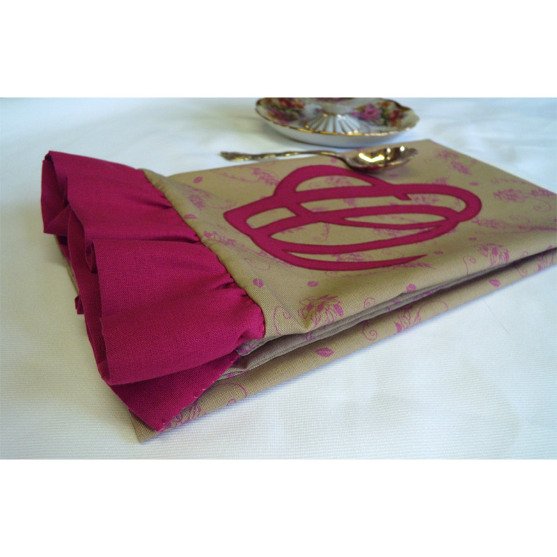To go with this fabulous soap I decided to make a handmade towel.  I fell in love with the tan and pink fabric and searched high and low for a match (I got as close as I could).  The towel is double sided so the pretty pattern is on both sides and the ruffle and monogram are of the same fabric.